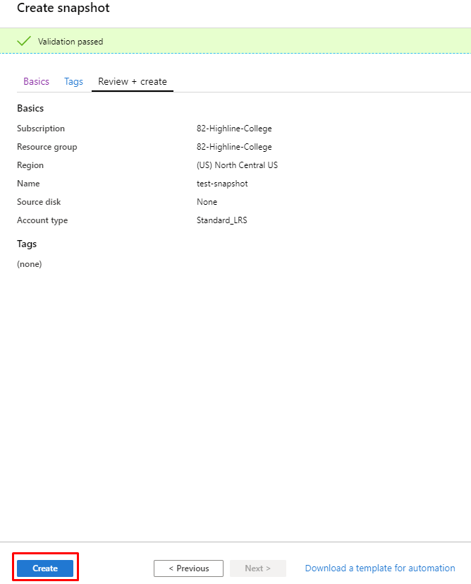 5. A validation test will be ran, and if your validation passed, you can now click ‘create’ to finish creating your new managed disk. If validation failed, you will need to go back and correct the settings that caused it to fail.